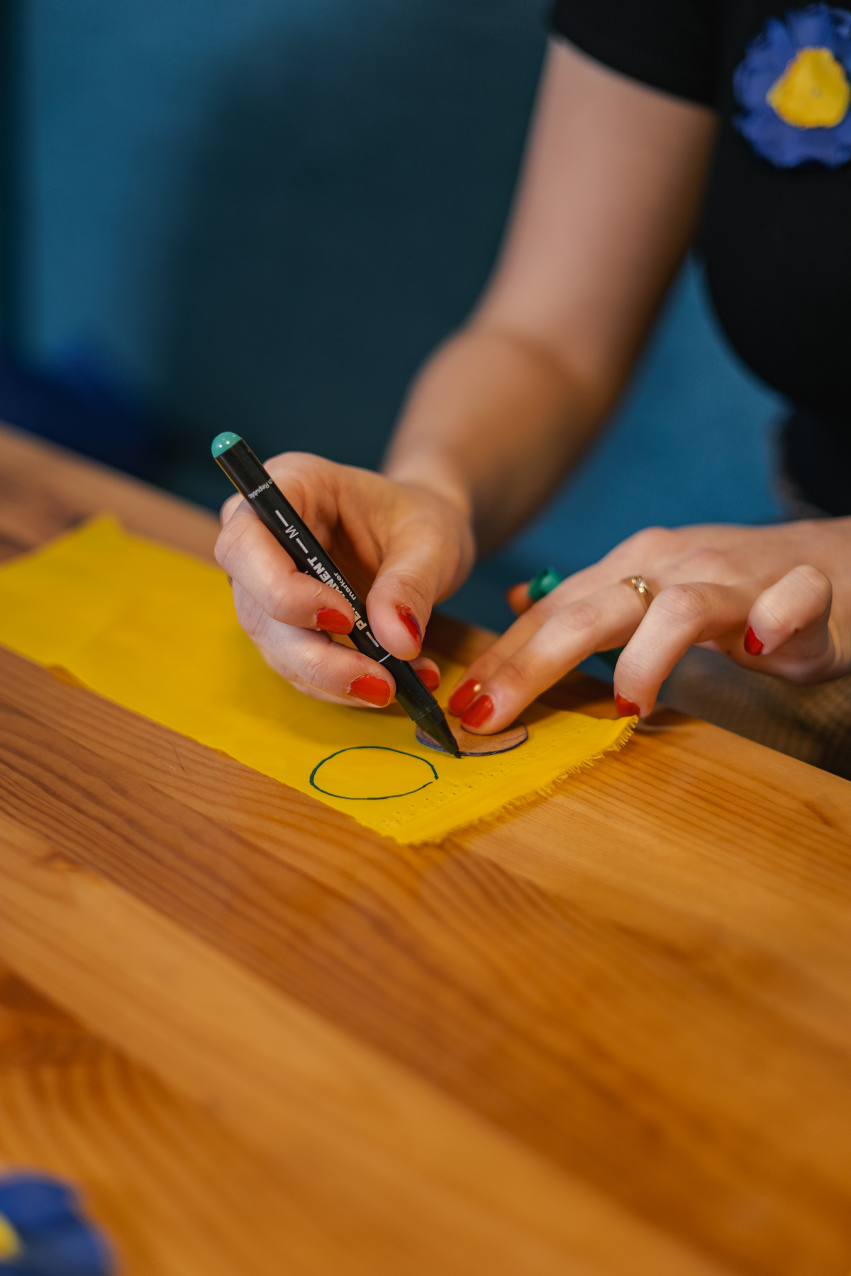 Зробити ці брошки дуже просто: перш за все, вам потрібно буде придбати — за свій бюджет — пластикову тканину (українських кольорів), котушку ниток, кілька голок, ножиць і запальничку. З однієї тканини потрібно буде вирізати два кола (діаметром 7-8 сантиметрів), а з іншої – два менших (діаметром 3-4 сантиметри). Далі ви 8 надрізів на вирізаному колі, щоб отримати пелюстки, і злегка підпаліть край пелюсток (щоб тканина не потріскалася). Нарешті ви зшийте чотири частини разом і додасте шпильку. Звичайно, ви можете змінити деякі інструкції та зробити їх у своєму стилі (вид тканини, розмір, пошиття…). Ми будемо вдячні за вашу допомогу та пожертву. Адже не буває великої організації без окремих кроків.