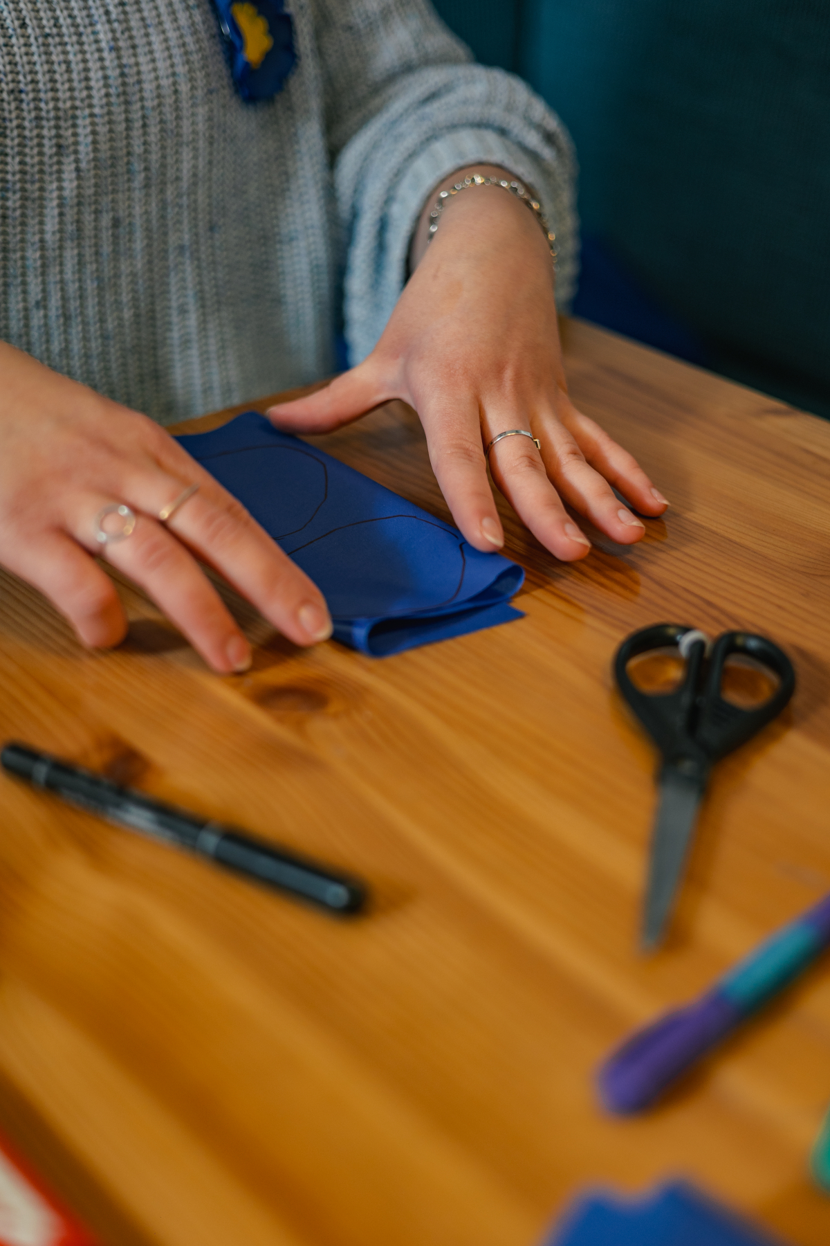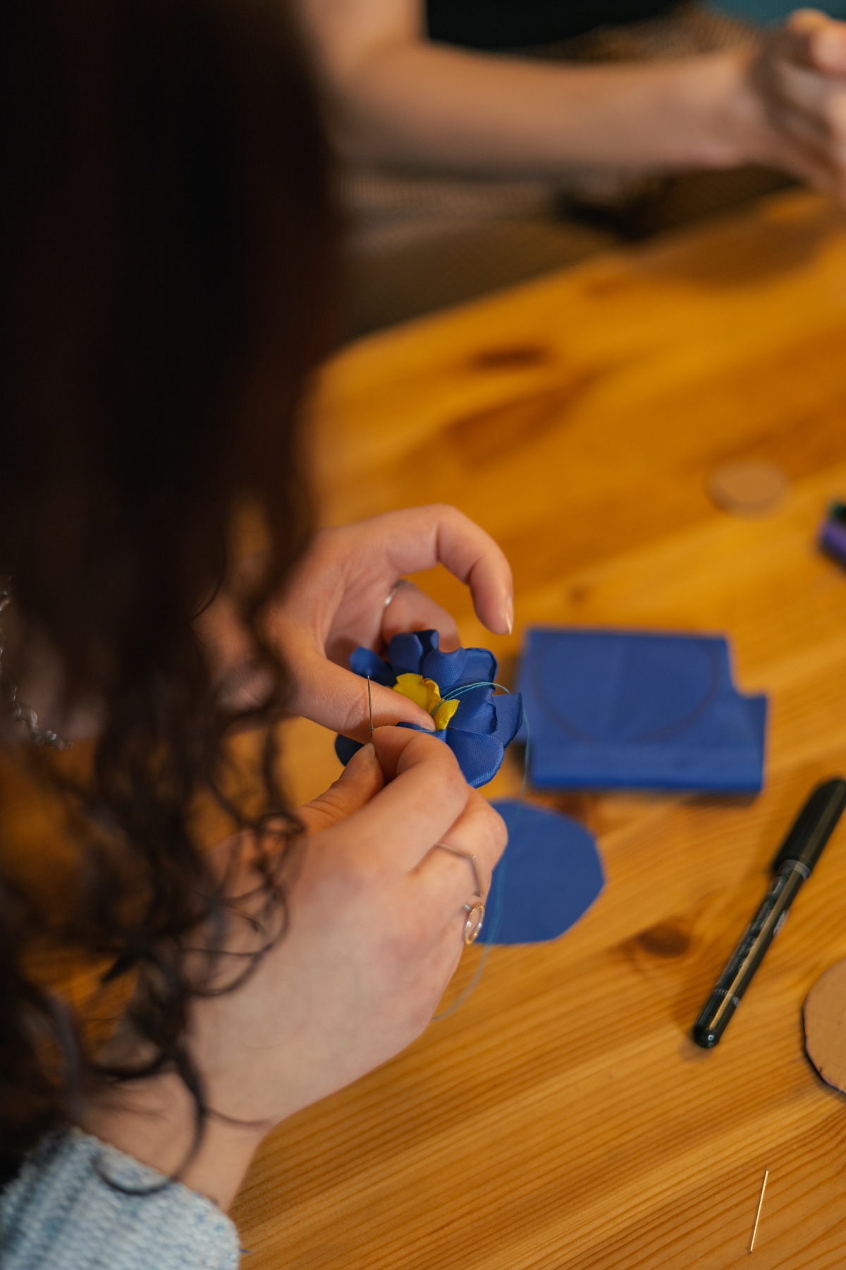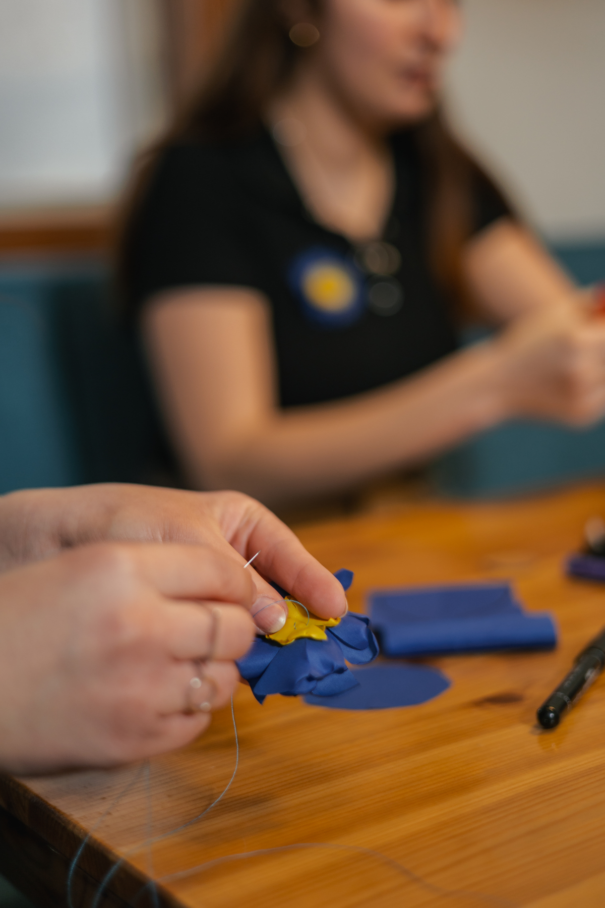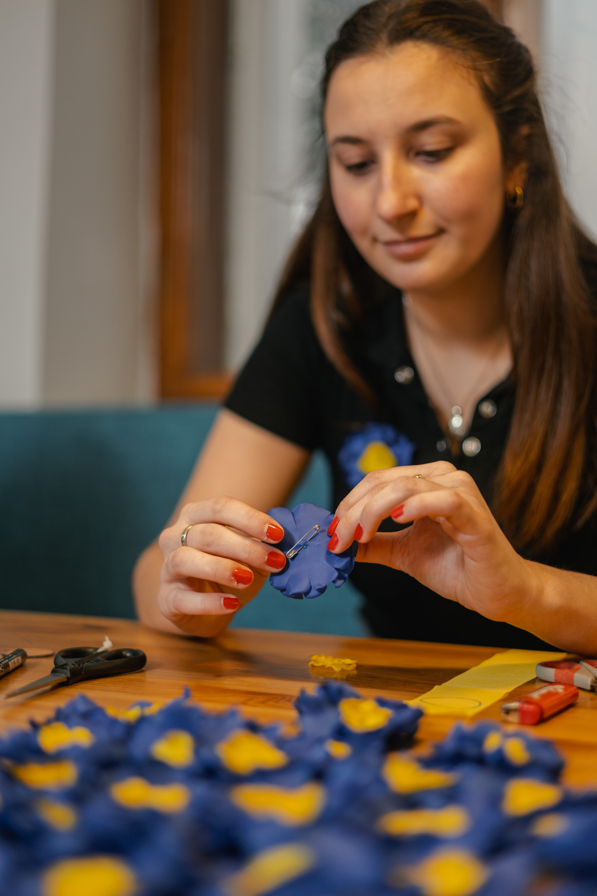 Y: Každý z nás prožil začátek války po svém. Musím říct, že jsem doteď nevstřebala tu naprosto absurdní a šílenou situaci, ve které se má země ocitla. Některé dny jsem toužila po nicnedělání, jindy mě přemáhal neskutečný vztek. Pořád jsem si říkala, že zvládnu dělat víc, ale i přesto to nikdy nebude stačit. Snažila jsem se najít způsob, jak bych mohla poskytnout pomoc lidem, které zasáhla válka přímo, a začala jsem přemýšlet o spolupráci s dobrovolnickou organizací. Naštěstí jsem potkala lidi, kteří se později stali mými dobrými přáteli. Právě Aglaé je jednou z takových kamarádek. To ona navrhla začít vyrábět květiny v barvách ukrajinské vlajky. Připojila se k nám také spolužačka z anglické filologie, Anička Štěpánová, která vyrábí plstěná srdíčka.