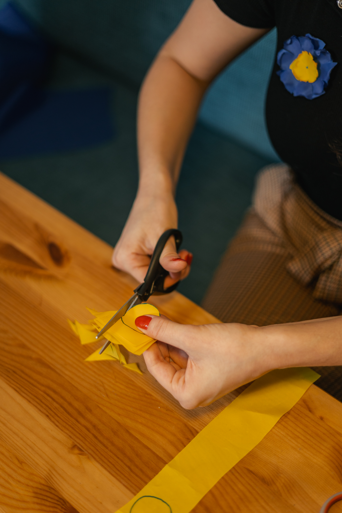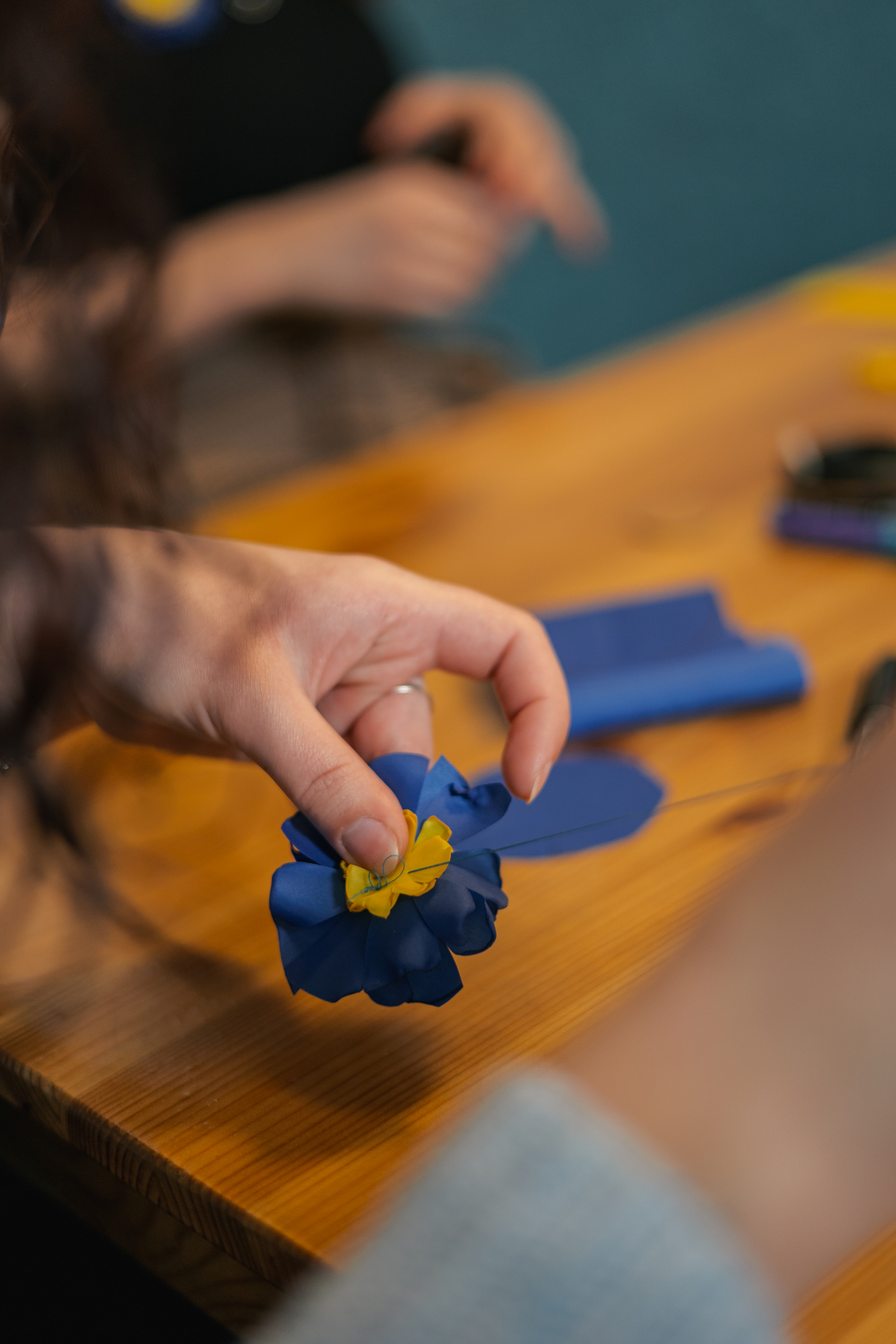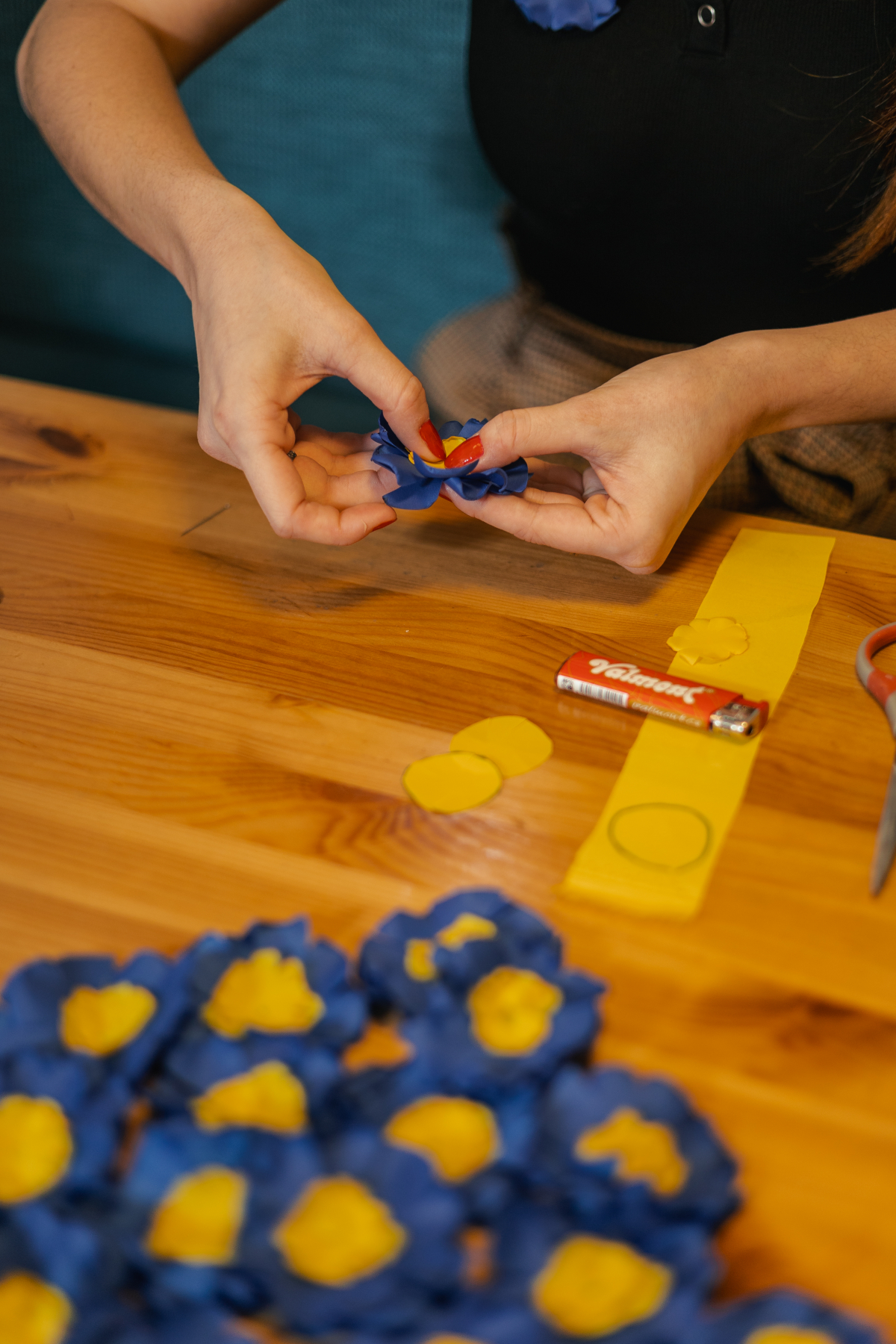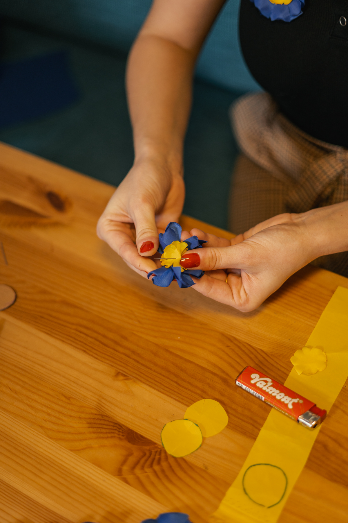A: Výroba těchto květin je velmi jednoduchá. Nejprve si musíte sehnat látky z umělého materiálu v ukrajinských barvách, nit, jehlu, spínací špendlíky, nůžky a zapalovač. Do jedné látky vystřihněte dva kruhy o průměru asi 7–8 centimetrů a do druhé vystřihněte dva menší kruhy o průměru 3–4 centimetrů. Dále na každém kolečku směrem od okraje ke středu udělejte 8 nástřihů, ze kterých vzniknou okvětní lístky. Jejich okraje následně kolem dokola lehce opalte zapalovačem, čímž okraje zatavíte a nebudou se dále třepit. Nakonec všechny 4 díly uprostřed sešijte a přidejte špendlík.