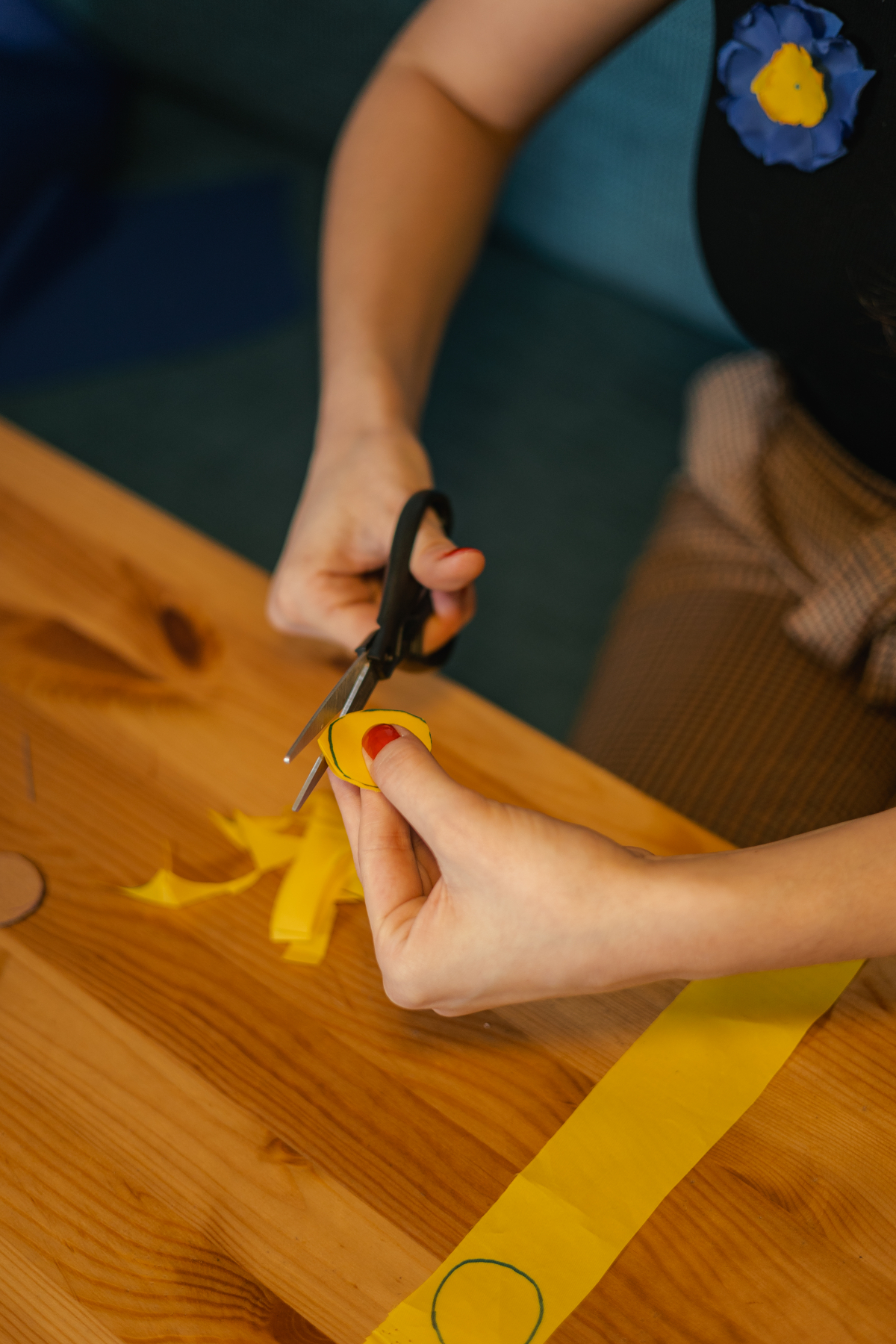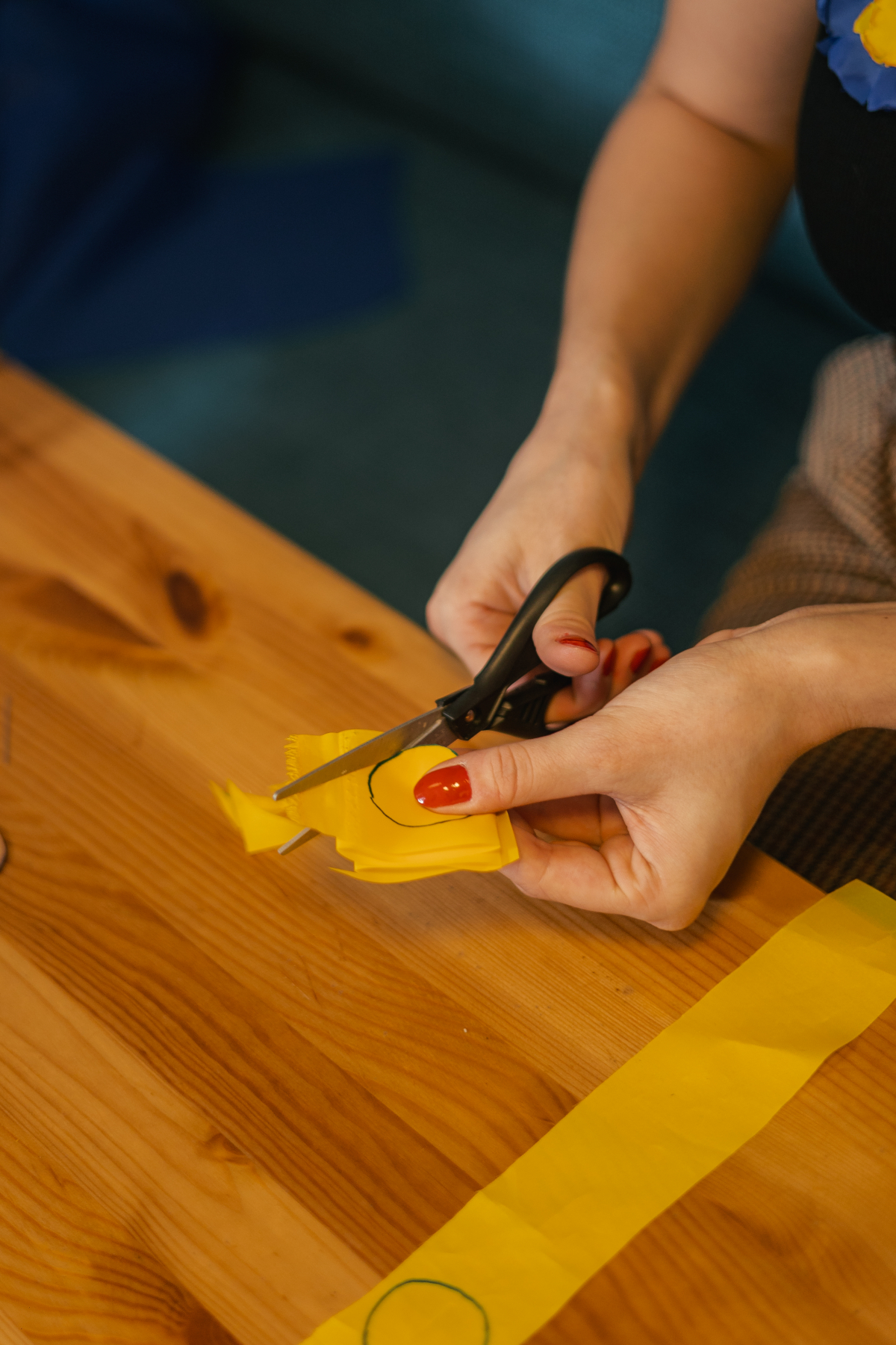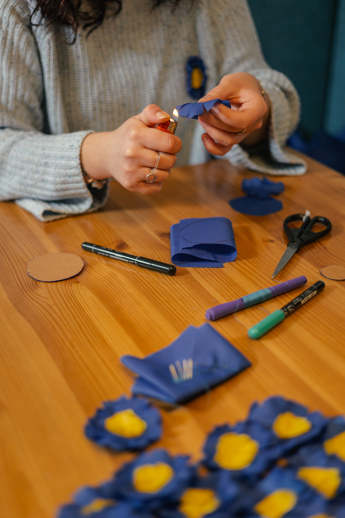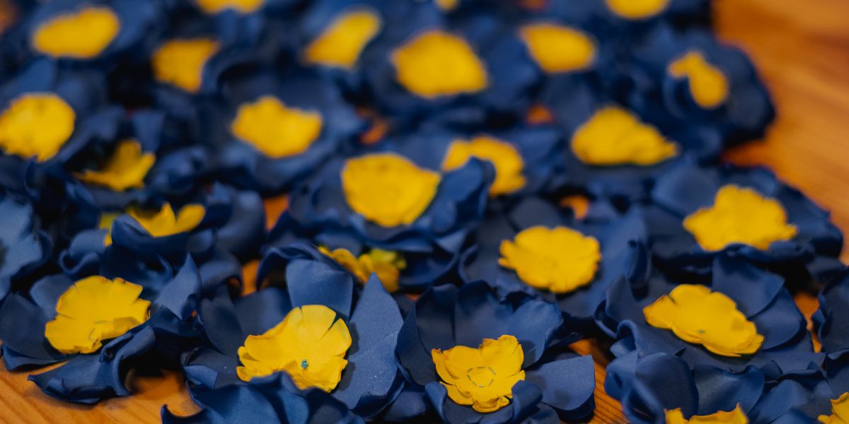 A: Výroba těchto květin je velmi jednoduchá. Nejprve si musíte sehnat látky z umělého materiálu v ukrajinských barvách, nit, jehlu, spínací špendlíky, nůžky a zapalovač. Do jedné látky vystřihněte dva kruhy o průměru asi 7–8 centimetrů a do druhé vystřihněte dva menší kruhy o průměru 3–4 centimetrů. Dále na každém kolečku směrem od okraje ke středu udělejte 8 nástřihů, ze kterých vzniknou okvětní lístky. Jejich okraje následně kolem dokola lehce opalte zapalovačem, čímž okraje zatavíte a nebudou se dále třepit. Nakonec všechny 4 díly uprostřed sešijte a přidejte špendlík.