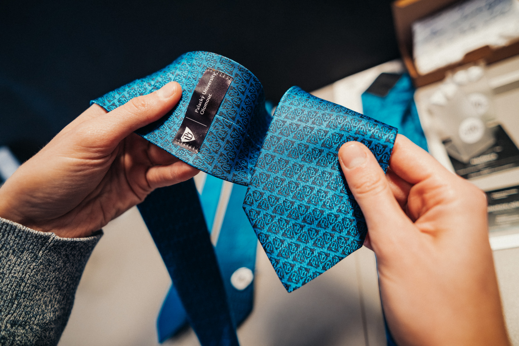 Do této skupiny doplňků patří také kapesníček s motivem dopisu Františka Palackého. Jemný detail, který odkazuje k historii univerzity, ale zároveň působí elegantně. Pro ty, kteří dávají přednost ještě více subtilním symbolům, je tu brož – univerzitní špendlík, který lze připnout na klopu saka ale také na šaty. Univerzálním doplňkem je také decentní šála se znakem UP, která je příjemná na dotek a zahřeje vás při cestě za vaším noblesním večerem.