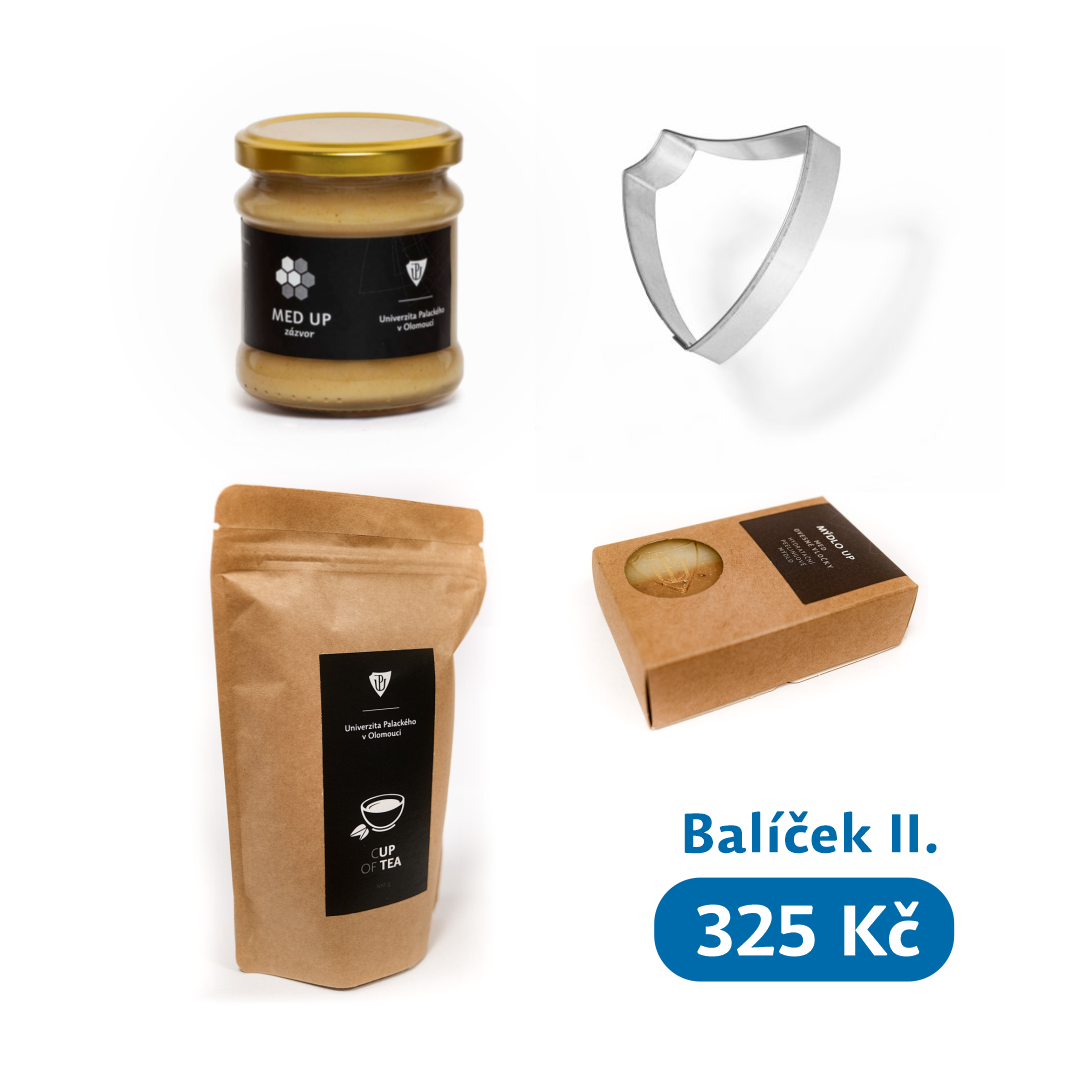 - Větší balíček vás potěší sypaným čajem UP, ochuceným medem z místní včelařské farmy, univerzitním vykrajovátkem a medovým mýdlem a vyjde vás na 325 Kč.