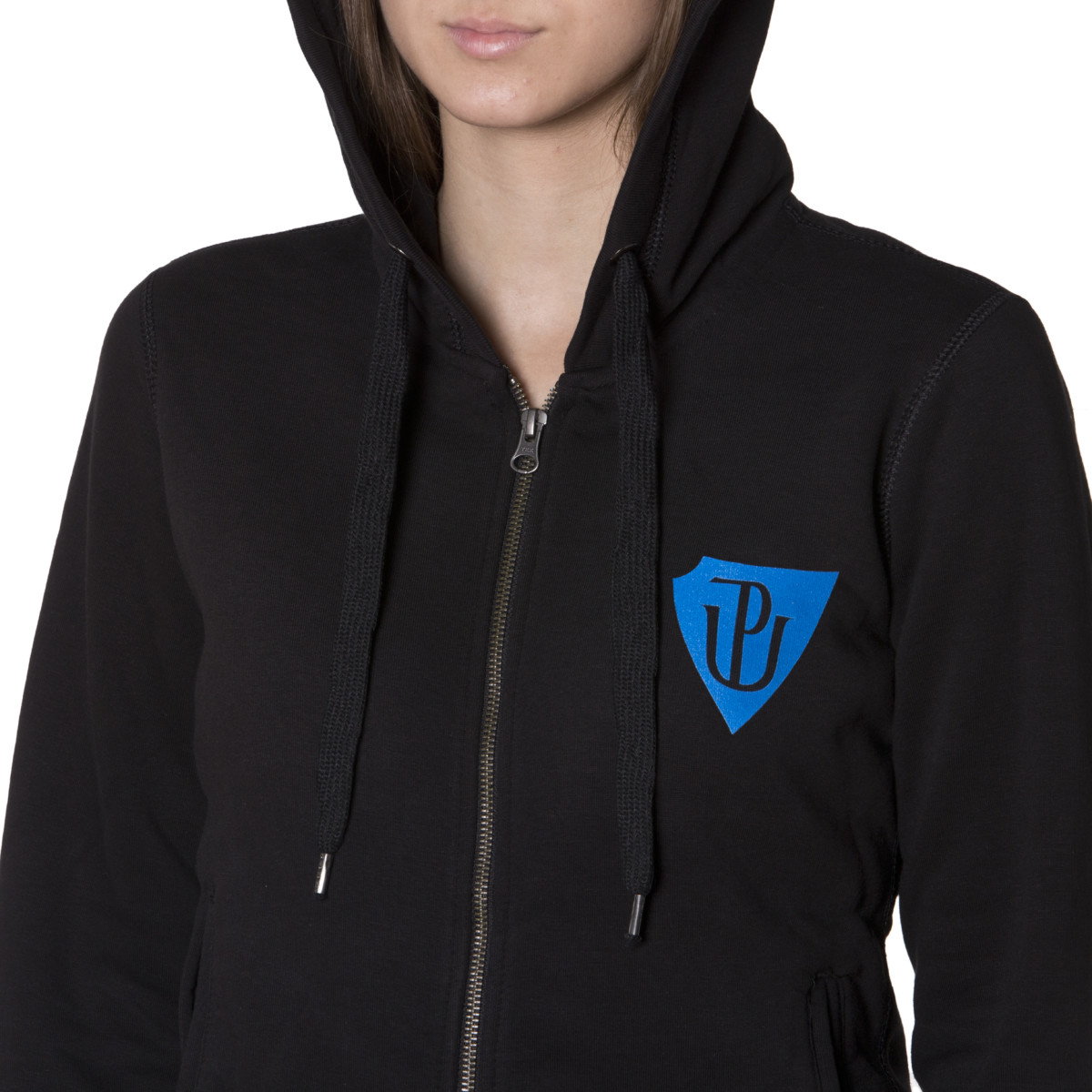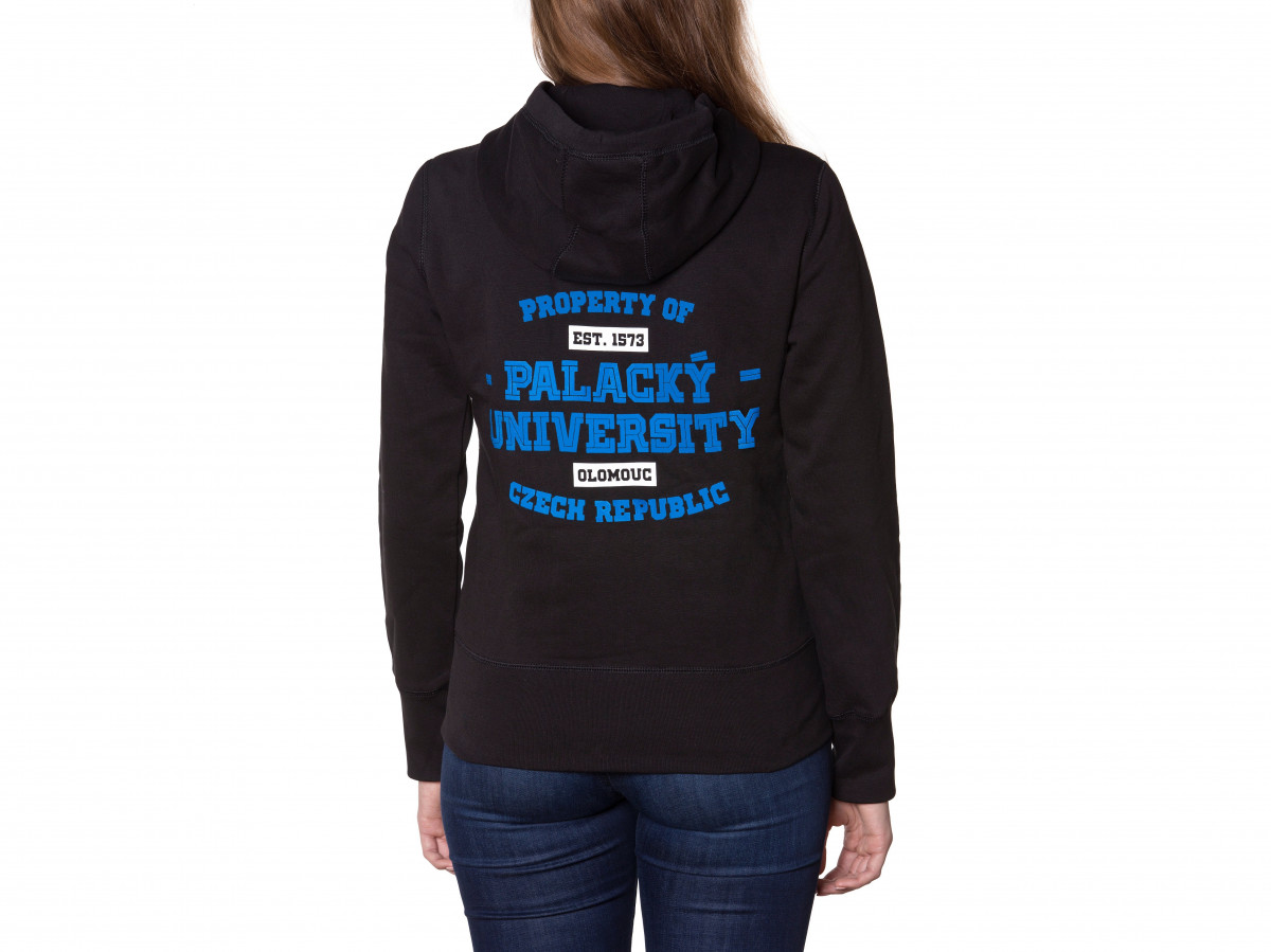 Černá propínací mikina s kapucí z organické bavlny, s modrý znakem UP na srdci a výrazným potiskem na zádech.