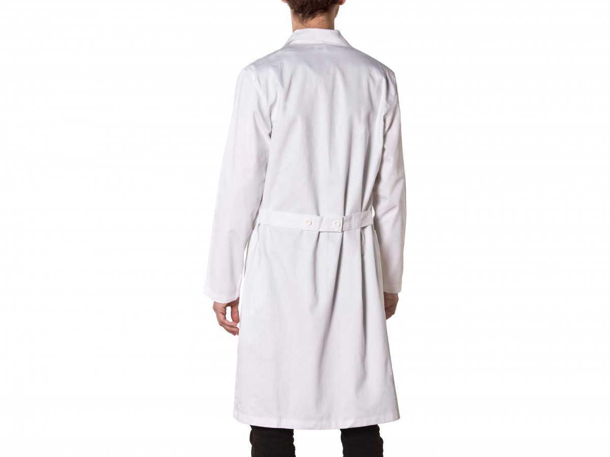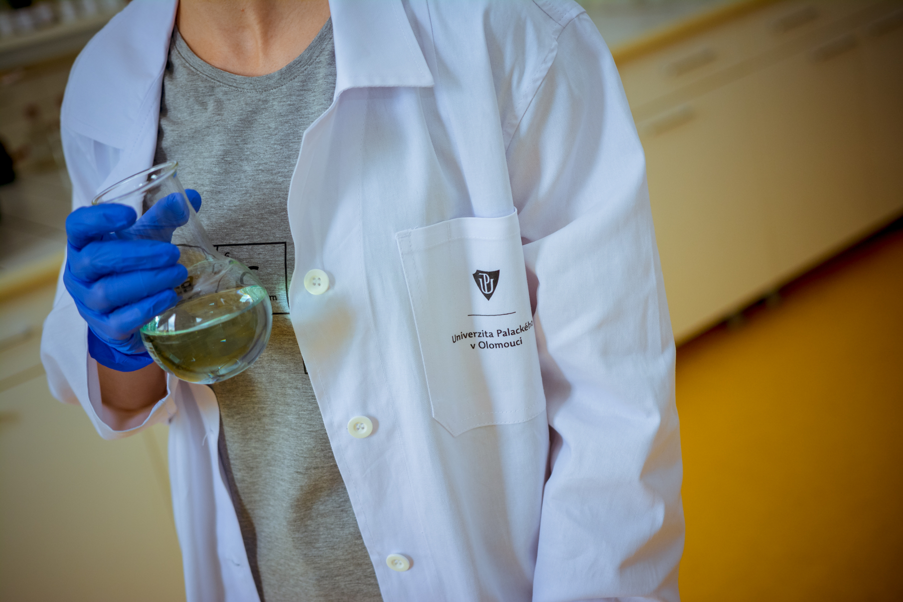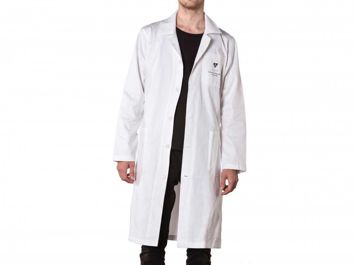Bílý laboratorní plášť s dlouhými rukávy, zapínáním na knoflíky, páskem, dvěma kapsami a náprsní kapsičkou s logem Univerzity Palackého.