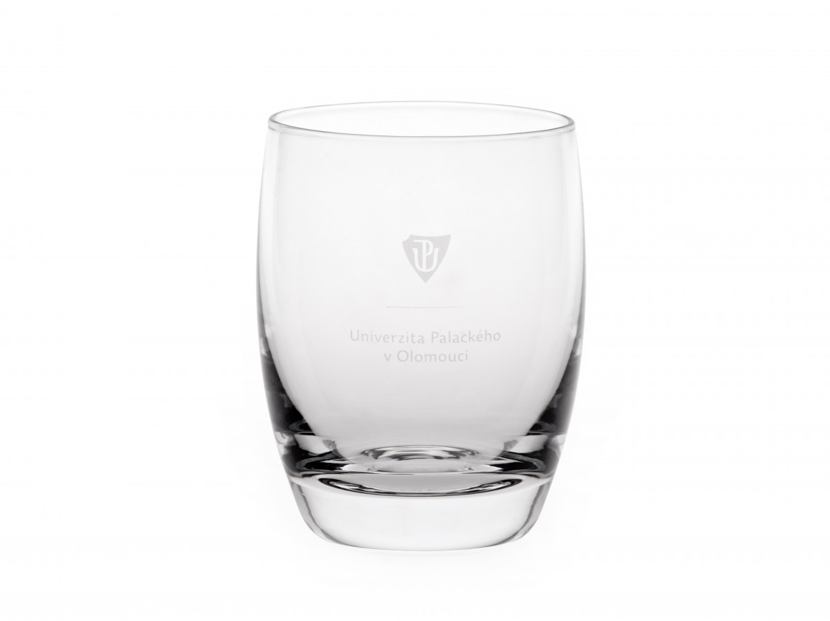 Ručně vyráběná křišťálová sklenička (odlivka) s pískovaným logem Univerzity Palackého v Olomouci.